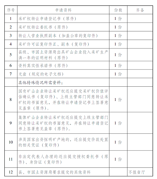 1.采礦權(quán)轉(zhuǎn)讓申請(qǐng)登記書(shū)(原件)。格式規(guī)范,內(nèi)容完整,加蓋申請(qǐng)人公章,填寫礦山名稱、轉(zhuǎn)讓申請(qǐng)人、法定代表人、采礦權(quán)取得時(shí)間及方式、采礦權(quán)轉(zhuǎn)讓原因及方式、采礦許可證證號(hào)、發(fā)證機(jī)關(guān)、有效期限、采礦權(quán)評(píng)估值、采礦權(quán)轉(zhuǎn)讓底價(jià)、評(píng)估機(jī)構(gòu)名稱、評(píng)估機(jī)構(gòu)資格證號(hào)、應(yīng)繳納的采礦權(quán)使用費(fèi)、應(yīng)繳納的礦產(chǎn)資源補(bǔ)償費(fèi)、應(yīng)繳納的資源稅、應(yīng)繳納的采礦權(quán)價(jià)款、采礦權(quán)屬有無(wú)爭(zhēng)議、采礦權(quán)價(jià)款繳納方式、礦區(qū)面積。