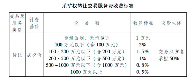 說(shuō)明:采礦權(quán)交易服務(wù)費(fèi)采用按交易額和費(fèi)率分段累加計(jì)費(fèi)。超額累進(jìn)計(jì)算法為:交易服務(wù)費(fèi)=Σ(總成交價(jià)相應(yīng)級(jí)距部分金額×相應(yīng)級(jí)距比例)