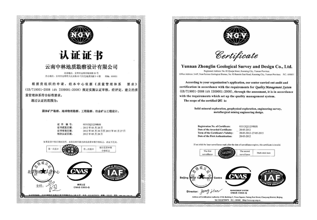 聯(lián)系地址:昆明市人民東路93號(hào)省有色地質(zhì)局附樓3- 4樓[電子地圖]ISO質(zhì)量體系認(rèn)證證書(shū)